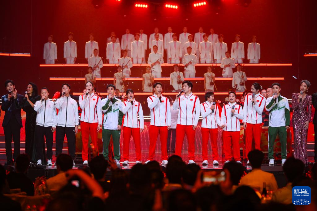 9月22日,张子浚(前排左六)、张子澄(前右二)参演了2024“湾区升明月”大湾区电影音乐晚会,与参加巴黎奥运会的内地健儿一起演唱《我爱你中国》。新华社记者 张金加 摄