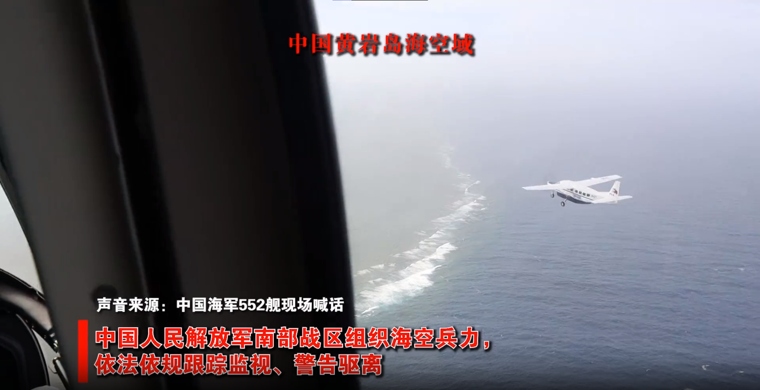 2月18日,菲C-208型機以不專業、危險方式,蓄意近距穿越中方正常巡邏直升機高度層的錄像截圖 圖源:南部戰區