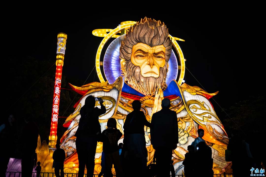 燈會亮點眾多,18米高的“簪花女神”依水而立,結合動態眨眼設計,在燈光映照下栩栩如生,將東方古典之美展現得淋灕盡致。16米高的“黑悟空”燈組則以金屬線條勾勒輪廓,搭配賽博朋克光影特 效,重塑經典神話形象。