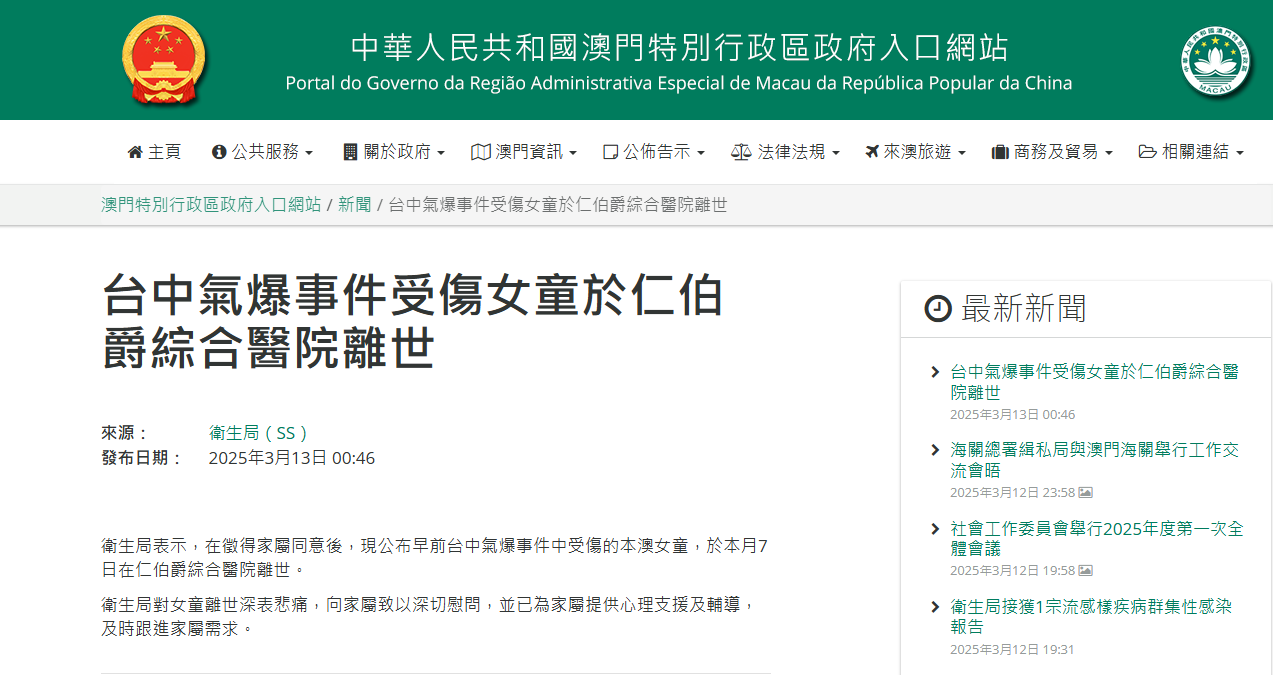 澳門衛生局凌晨表示,征得家屬同意後公佈早前在台中氣爆事件中受傷的女童,於本月7日在仁伯爵醫院離世。當局對此深表悲痛,并向家屬致以深切慰問,在提供心理支援及輔導外,亦會跟進家屬的需求。