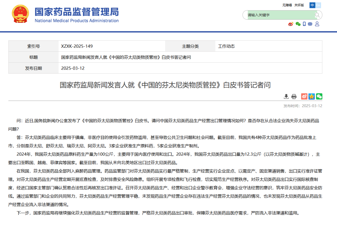 有記者問,近日,中國國務院新聞辦公室發佈了《中國的芬太尼類物質管控》白皮書。請問中國芬太尼類藥品生產經營出口管理情況如何?是否存在從合法企業流失芬太尼類藥品問題?中國國家藥監局新聞發言人作出上述回應。