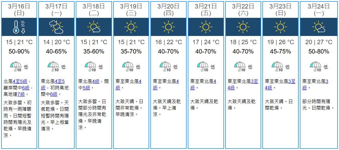 天文台指出,未來兩三日清晨氣溫較低,日間偶有陽光。明日(16日)風勢較大,下周中後期則大致天晴,天氣乾燥。