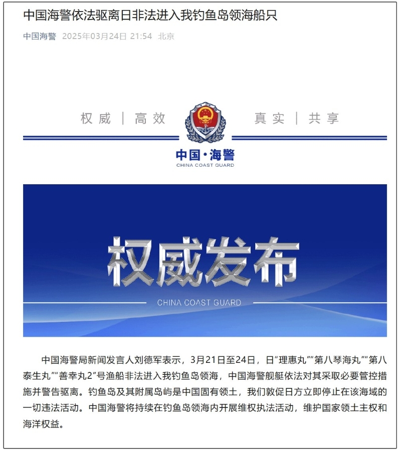 香港新聞網3月25日電 中國海警局新聞發言人劉德軍表示,3月21日至24日,日“理惠丸”“第八琴海丸”“第八泰生丸”“善幸丸2”號漁船非法進入中國釣魚島領海,中國海警艦艇依法對其採取必要管控措施並警告驅離。