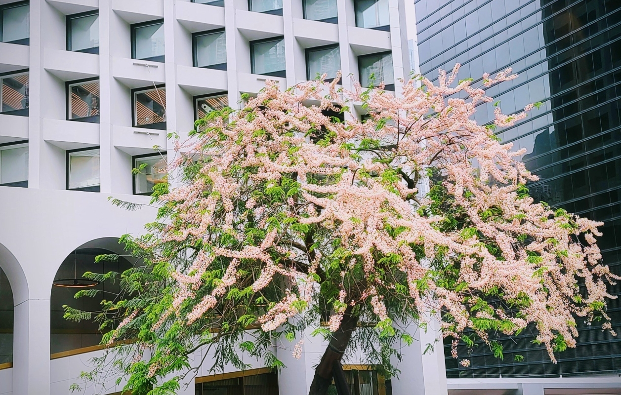 每年4至5月,位於中環美利酒店前庭的節果決明古樹都會慢慢綻放。圖為往年景象。(香港中通社記者 黃璇攝)