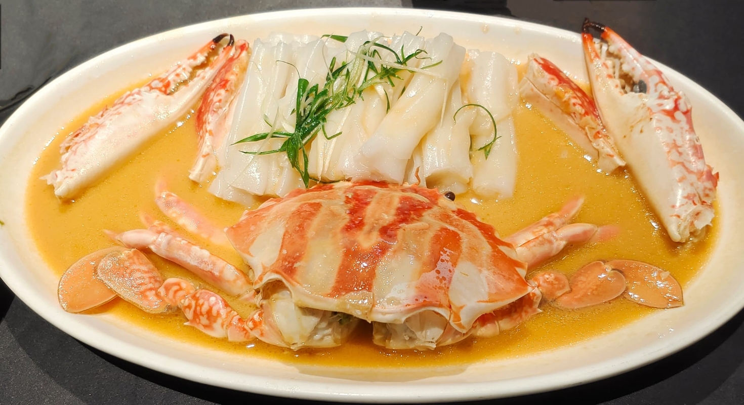 雞油花雕蒸花蟹配陳村粉是大班樓的長青招牌菜。(香港中通社記者 黃璇攝)