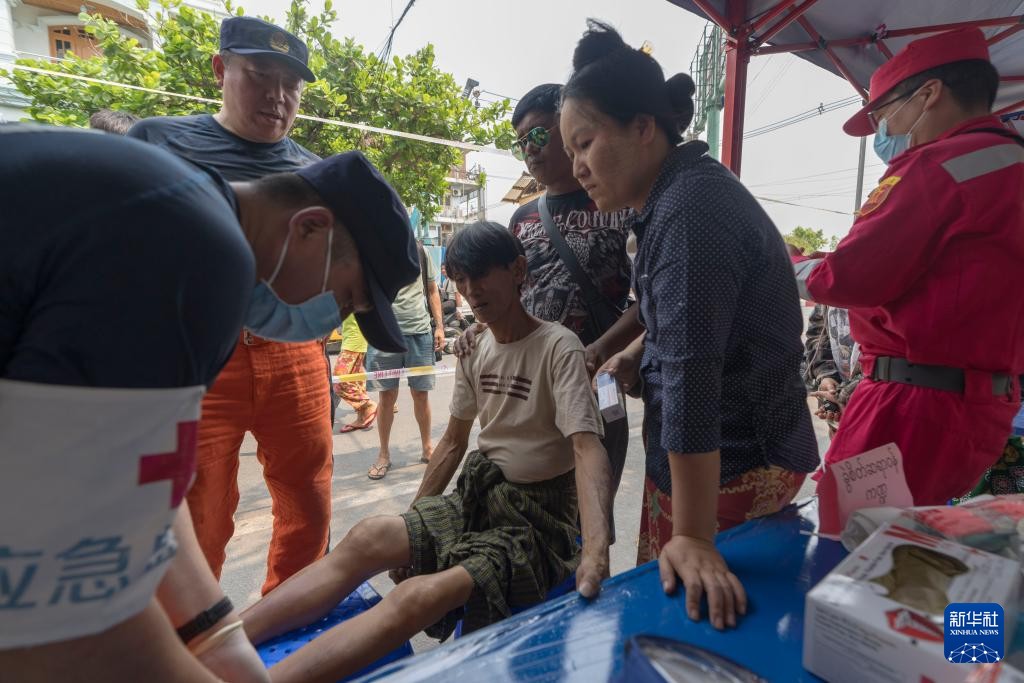 4月4日,在緬甸曼德勒皇宮附近的一處安置點,中國救援隊隊員為一名男子檢查傷情。新華社圖片
