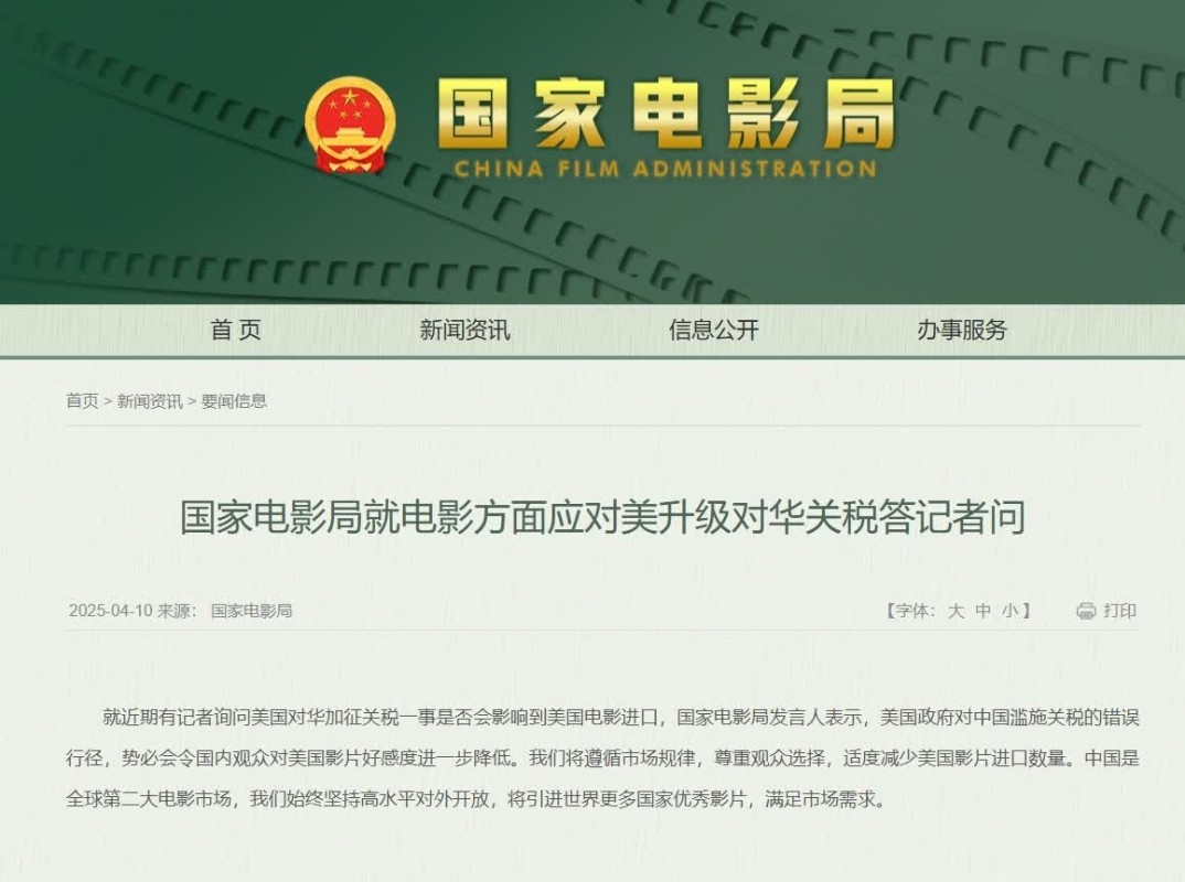 中國國家電影局10日表示,美國政府對中國濫施關稅的錯誤行徑,勢必會讓中國國內觀眾對美國影片好感度進一步降低,將遵循市場規律,尊重觀眾選擇,適度減少美國影片進口數量。