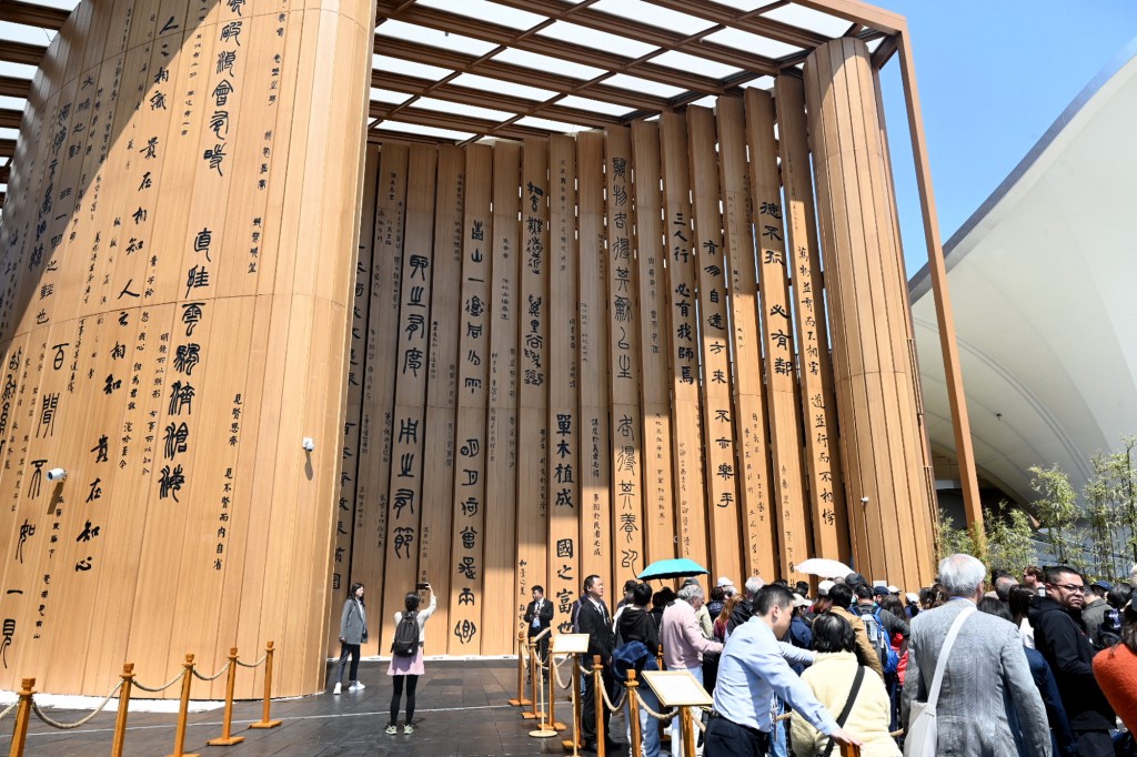 中國館竹黃色外立面以金、篆、隸、行、楷 5 種字體鐫刻著119句經典詩詞,涵蓋《詩經》《楚辭》、四書五經等經典著作。從《詩經》中 “關關雎鳩,在河之洲” 的純真質樸,到《楚辭》裡“路漫漫其修遠兮,吾將上下而求索”的浪漫與堅毅,這些詩詞跨越時空,如同一座文化寶庫,讓每一位觀者都能感受到中華文化的博大精深。