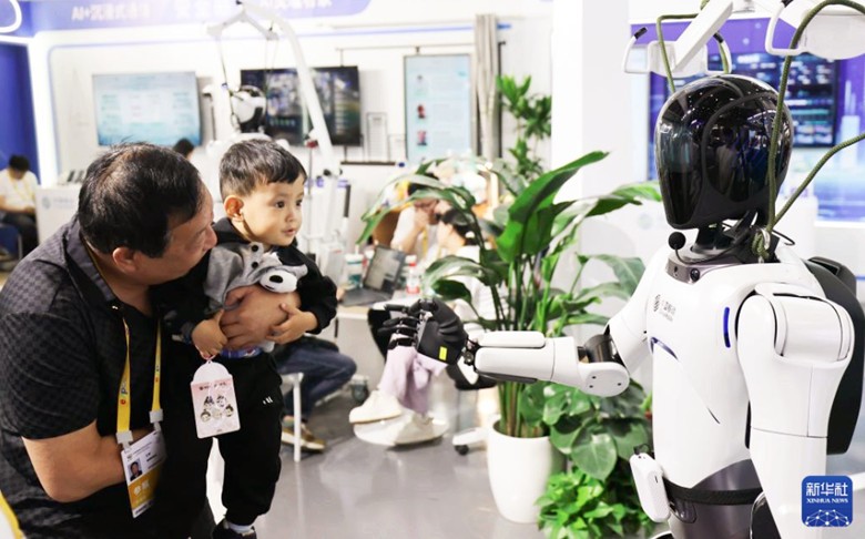 2025年4月14日,在第五屆中國消博會上,觀眾正在與中國移動展出的機器人互動。新華社圖