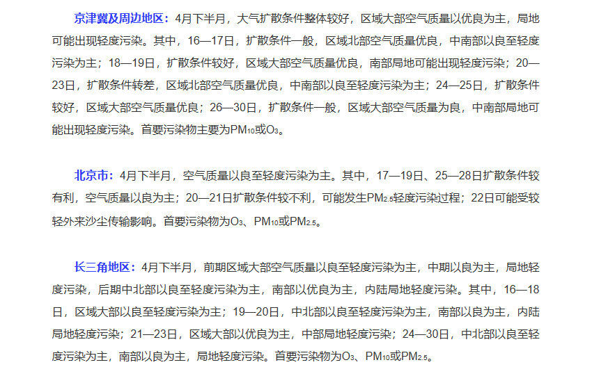 4月下半月,全國大部空氣質量以優良至輕度污染為主。京津冀及周邊區域大氣擴散條件整體較好,大部空氣質量以優良為主,局地可能出現輕度污染。其中,北京市空氣質量以良至輕度污染為主。