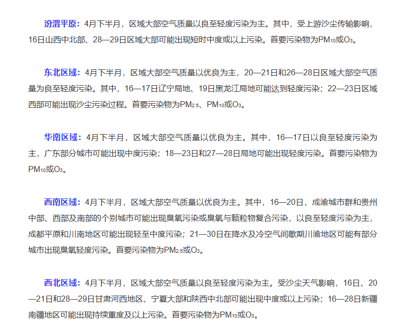 會商結果顯示,4月下半月前期,長三角區域大部空氣質量以良至輕度污染為主,中期以良為主,局地輕度污染,後期中北部以良至輕度污染為主,南部以優良為主。4月下半月,西北區域大部空氣質量以良至輕度污染為主。(完)