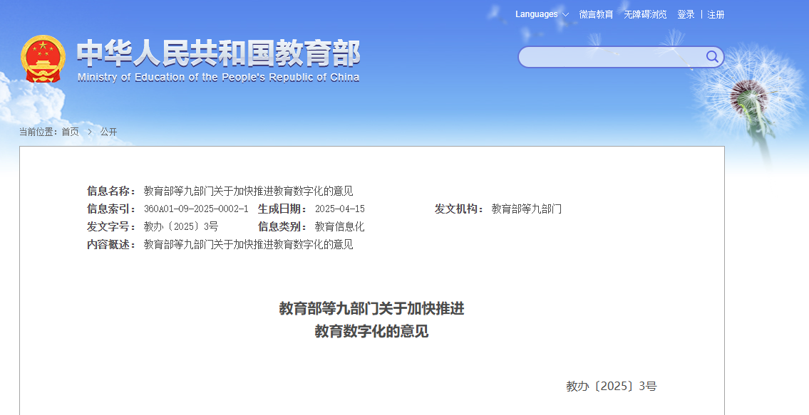 教育部等九部門印發《關於加快推進教育數字化的意見》 圖源:中國教育部官網截圖