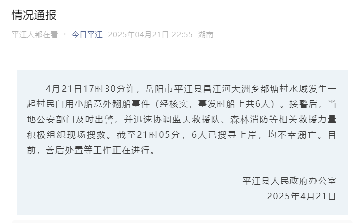 香港中通社4月22日電 據“今日平江”微信公眾號消息,中國湖南省岳陽市平江縣人民政府辦公室發布情況通報,4月21日17時30分許,岳陽市平江縣昌江河大洲鄉都塘村水域發生一起村民自用小船意外翻船事件(經核實,事發時船上共6人)。