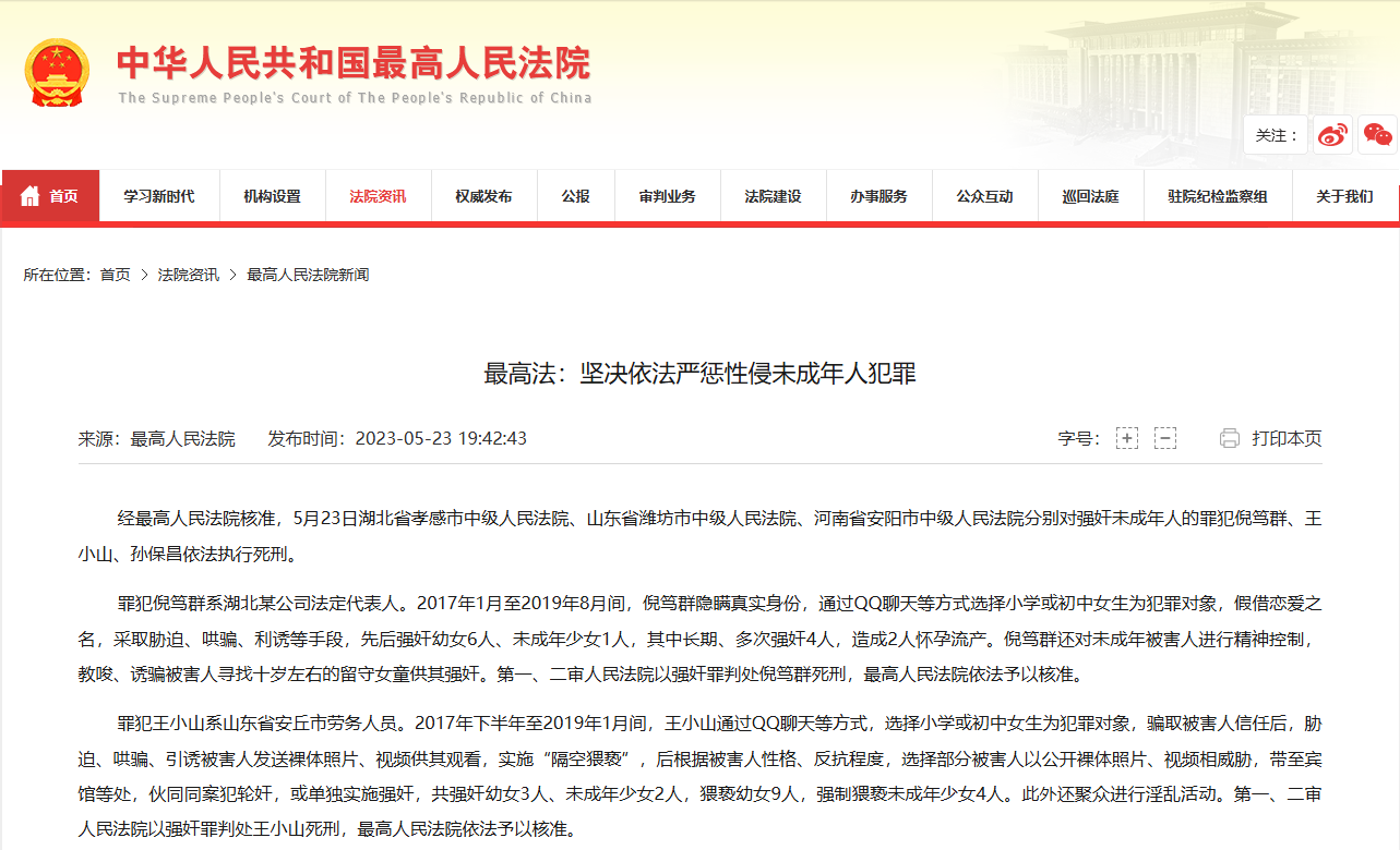 人民法院刑一庭負責人指出,此次對3名性侵害未成年人罪犯依法判處並執行死刑,彰顯了法院嚴懲此類犯罪的態度,向全社會宣告“侵害孩子者,必嚴懲不貸”。人民法院對性侵害未成年人犯罪始終堅持“零容忍”態度,依法嚴懲犯罪分子,體現對未成年人的特殊、優先保護。(完)