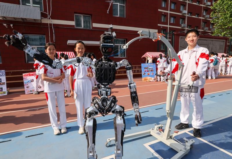 資料圖:在人大附中分校,學生在和機器人互動。圖片來源:新華社
