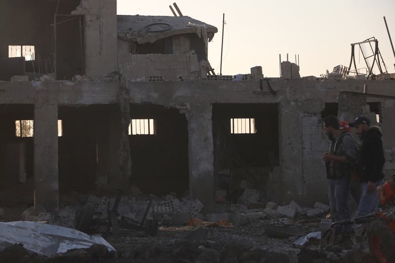 5月2日,在叙利亞南部蘇韋達省,人們查看在以色列空襲中損毀的建築。圖片來源:新華社