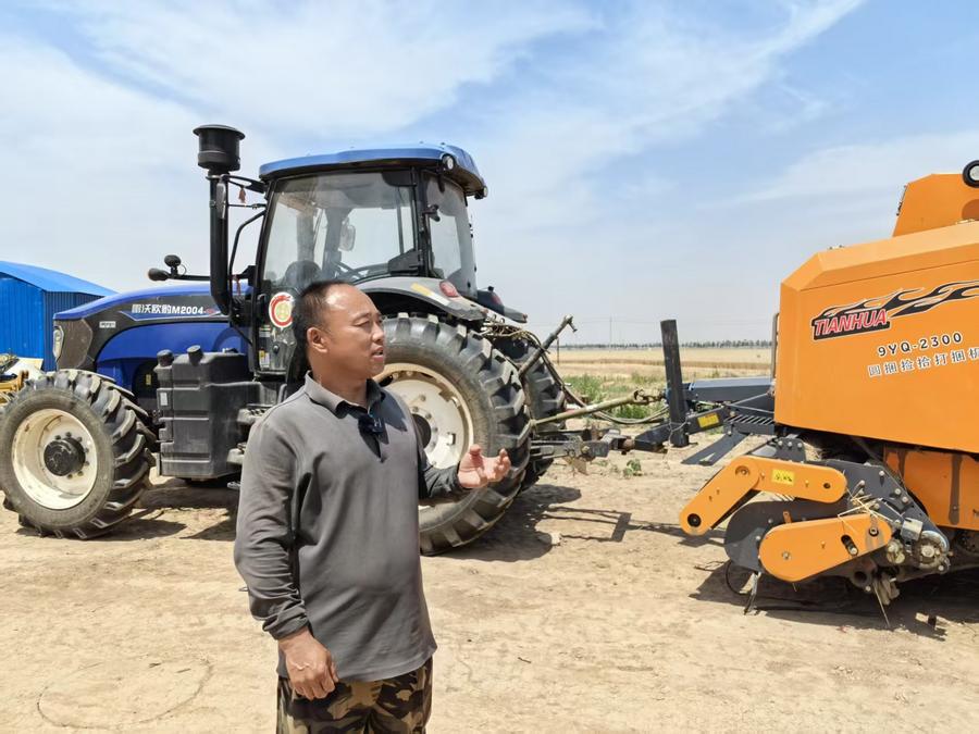 圖為河南滑縣小舖富強種植農民專業合作社理事長王付強正在合作社購買的“圓捆撿拾打捆機”旁邊介紹農機性能。新華社記者馬意翀攝
