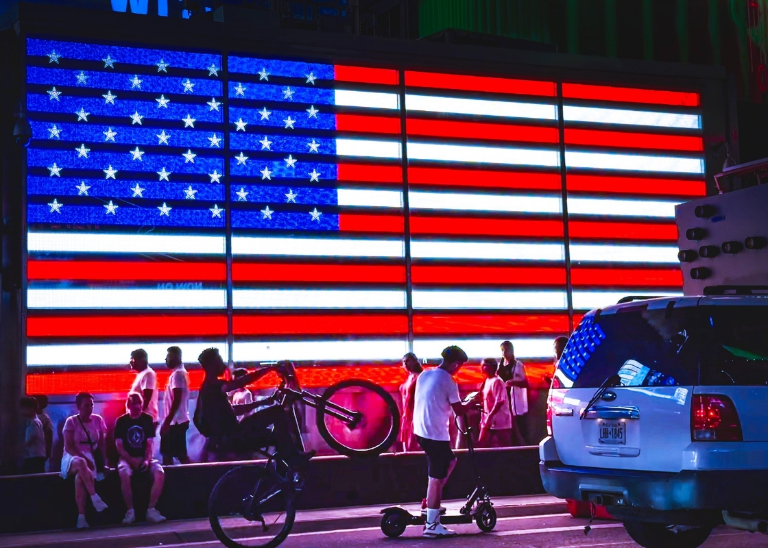 資料圖為民眾在紐約時代廣場亮著美國國旗的巨型屏幕下經過。香港中通社圖片