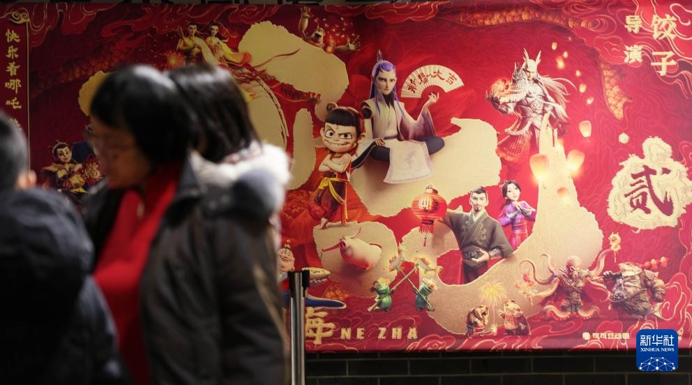 資料圖:這是2月6日在遼寧瀋陽一家影院拍攝的《哪吒之魔童鬧海》海報。 新華社圖片