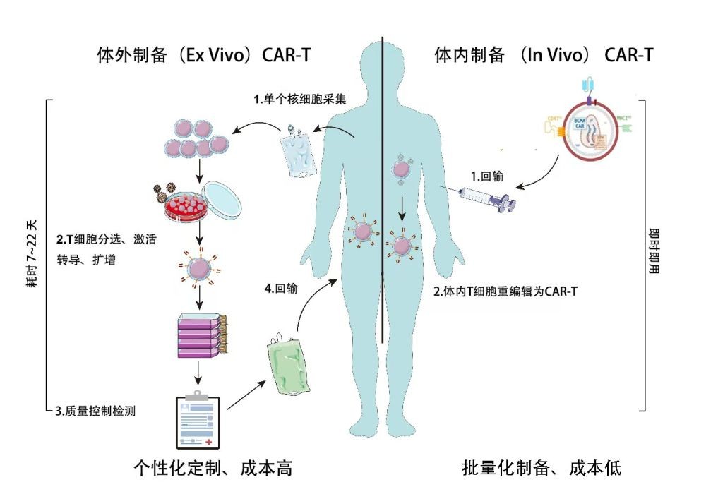 相較傳統體外制備CAR-T療法,體內CAR-T療法通過直接在患者體內制備嵌合抗原受體T細胞(CAR-T),顯著簡化操作流程,降低治療成本,大幅提升細胞療法的可及性與普適性。