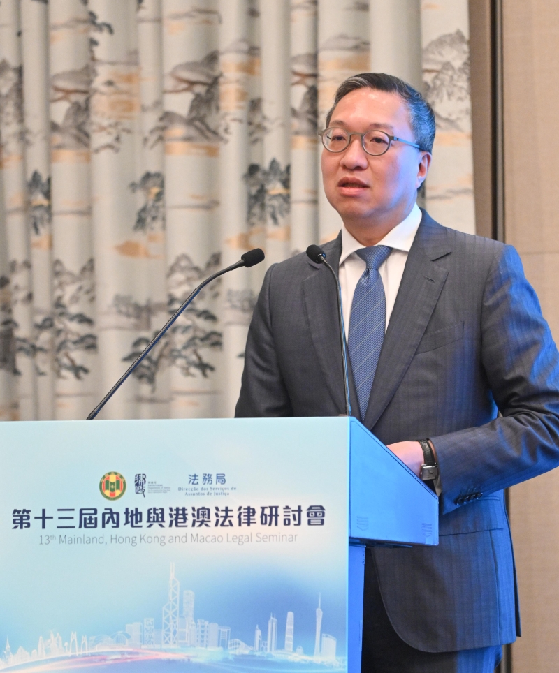 律政司司長林定國今日在第十三屆內地與港澳法律研討會開幕式致辭。圖源:政府新聞處