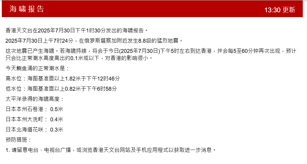 香港新聞網7月30日電 香港天文台30日下午1時30分發出海嘯報告,指俄羅斯堪察加附近於上午7時24分發生一次8.8級猛烈地震,並已產生海嘯。