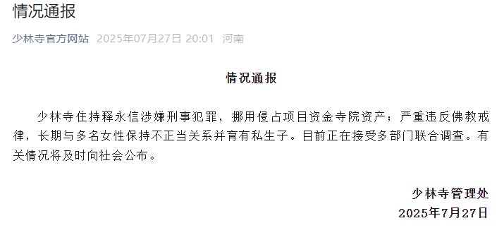7月27日晚,少林寺官網發布關於少林寺住持釋永信的情況通報。內容為:釋永信涉嫌刑事犯罪,挪用侵佔項目資金寺院資產;嚴重違反佛教戒律,長期與多名女性保持不正當關係並育有私生子。目前正在接受多部門聯合調查。有關情況將及時向社會公佈。