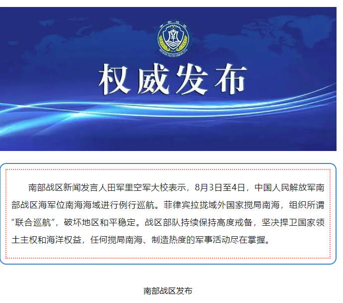 香港中通社8月4日電 據中國“南部戰區”微信公眾號消息,南部戰區新聞發言人田軍里空軍大校表示,8月3日至4日,中國人民解放軍南部戰區海軍位南海海域進行例行巡航。