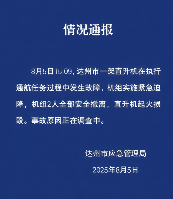四川達州應急管理局通報,8月5日15時09分,達州市一架直升機在執行通航任務過程中發生故障,機組實施緊急迫降,機組2人全部安全撤離,直升機起火損毀。