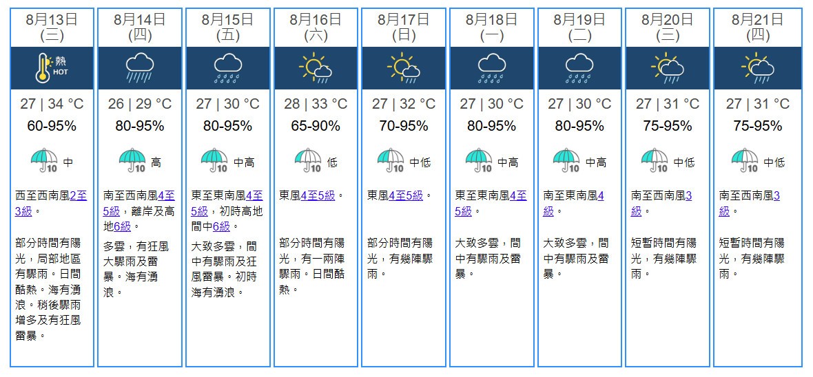 香港地區未來九天天氣預報。香港天文台網頁截圖