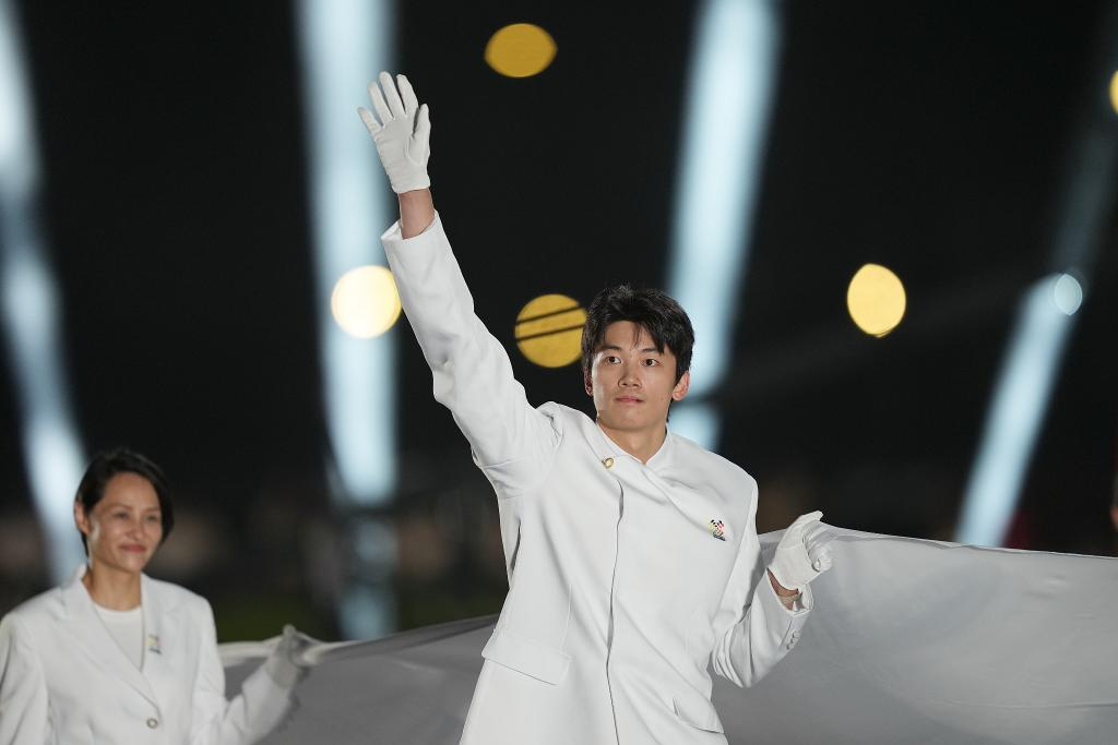 8月7日,國際奧林匹克委員會會旗執旗手汪順(右)在第12屆世界運動會開幕式上。圖片來源:新華社
