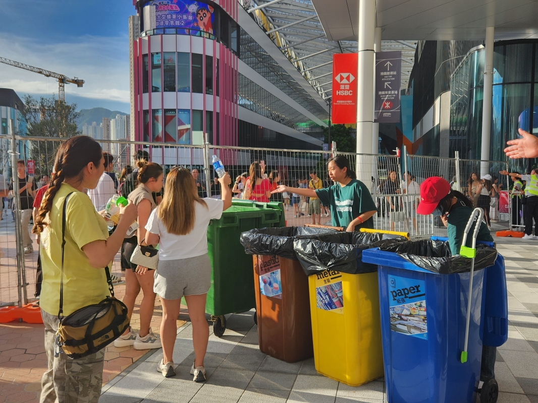回收大使向入場人士推廣環保知識,收集紙杯和廚餘等廢物