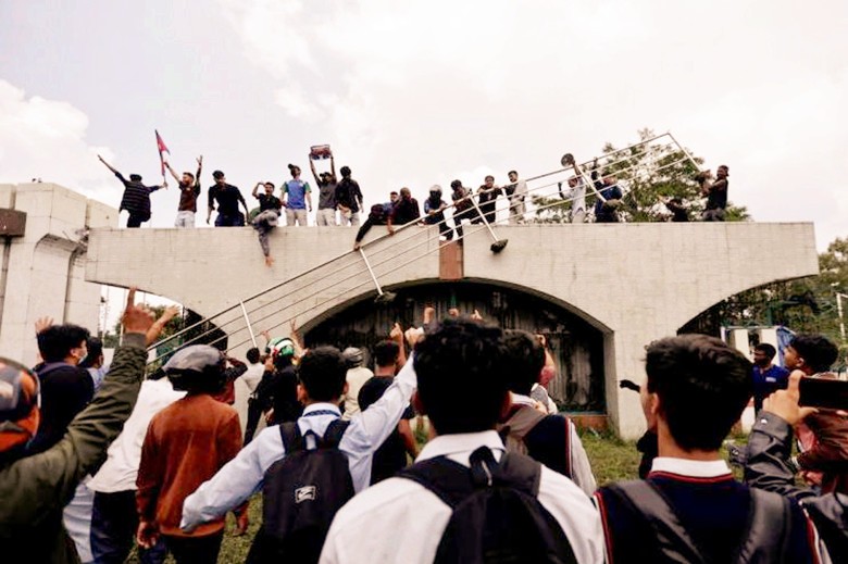 尼泊爾首都加德滿都的示威者聚集在議會大樓入口,許多人不顧警方阻攔,爬到樓頂平台。圖自社媒