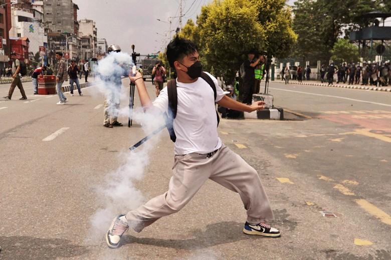 尼泊爾加德滿都的示威現場,警方與抗議者爆發衝突,一名參與抗議的男子戴著口罩,向防暴警察投擲催淚彈。圖自社媒