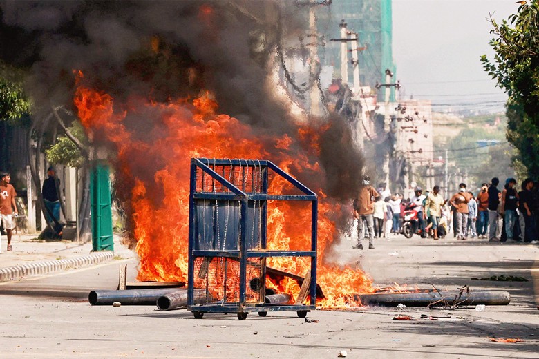 尼泊爾警方在加德滿都的議會大樓外放置的路障,被示威者縱火焚燒。圖自社媒