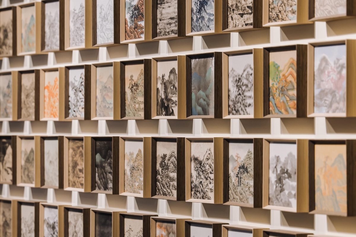 _.WAV_Studio_的作品涵蓋影片、裝置、互動和聲音藝術。《人工智能山水圖》系列透過學習數萬幅水墨作品,訓練出可無限生成的“山水繪畫機器”,同時借助三維物理模擬,帶來如“裸眼3D”般的沉浸體驗。《富春山居圖》把具備掃描功能的二維碼,轉化為可閱讀的山水景觀。《四時比鄰》系列把花木、岩石、水體與光影片段動態生成虛擬圖景,引導參觀者思考如何在算法與數據中重建對自然的感知。《高山流水經緯圖》則實時捕捉大灣區的山形脈絡,動態生成數碼山水。