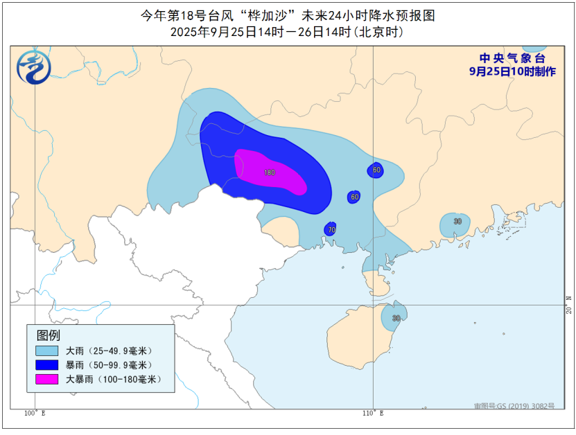廣西中南部、雲南東南部、貴州南部、廣東西部和北部、海南島東部等地部分地區有大到暴雨,其中,廣西西南部、雲南東南部等地部分地區有大暴雨。
