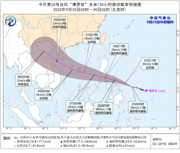 另外,颱風“博羅依”27日淩晨將進入南海。今年第20號颱風“博羅依”已於24日夜間加強為強熱帶風暴級,其中心25日早晨5點鐘位於菲律賓馬尼拉東偏南方向約990公里的西北太平洋洋面上,11級(30米/秒)。