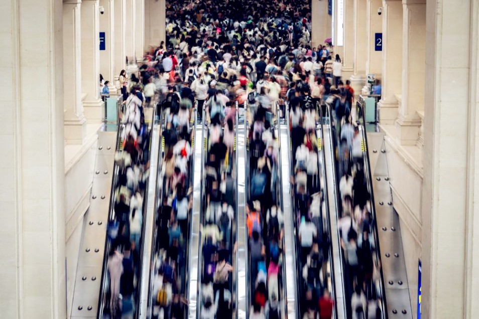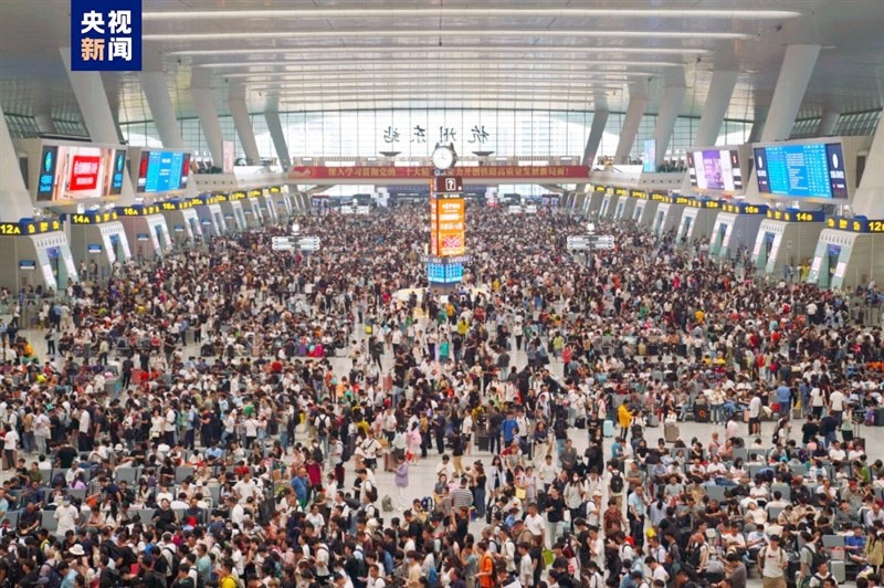 圖為2025年“十一”假期,中國浙江省杭州市杭州火車東站內的旅客。央視新聞圖
