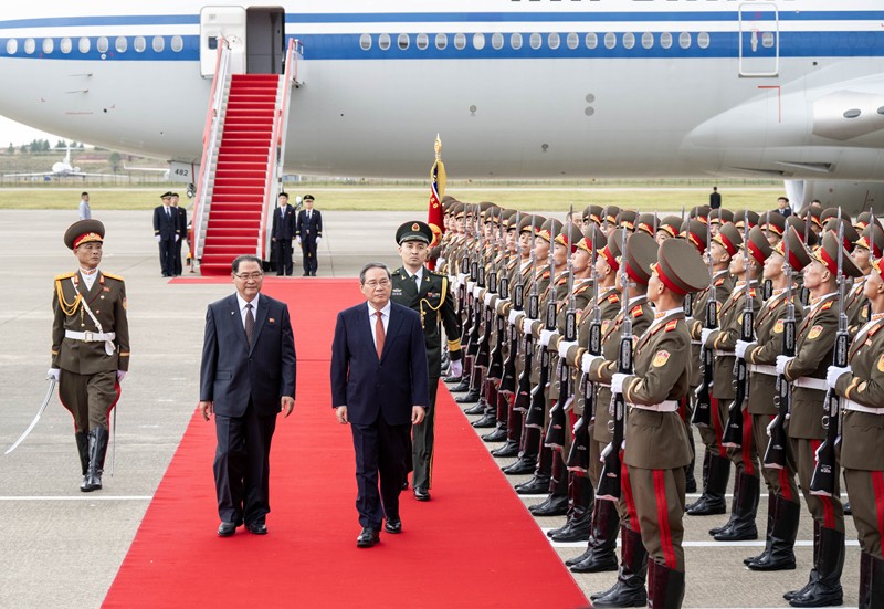 據中國官方消息,當地時間9日中午,李強乘包機抵達平壤順安國際機場。朝鮮勞動黨中央政治局常委、內閣總理朴泰成率黨和政府高級官員到機場迎接,並為李強舉行歡迎儀式。李強在朴泰成陪同下檢閱了儀仗隊。中國駐朝鮮大使王亞軍也到機場迎接。