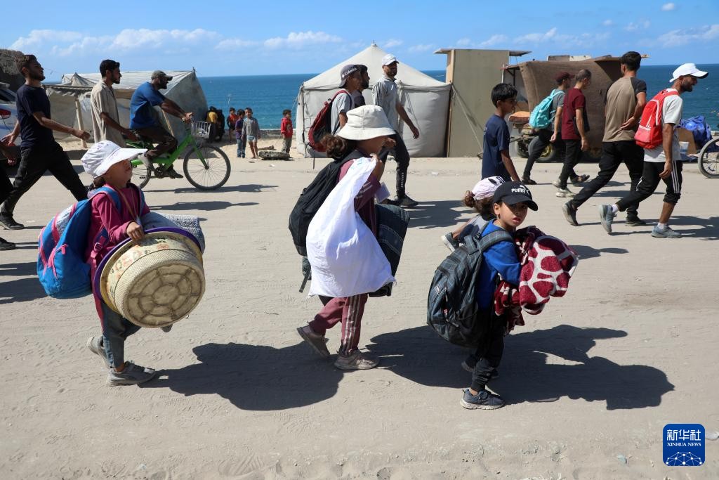 10月10日,在加沙地帶中部,逃離家園的巴勒斯坦民眾攜帶個人物品走在返回加沙城的路上。新華社圖片
