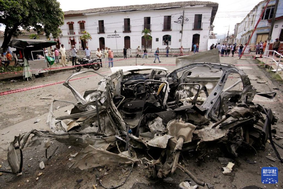 2025年6月10日,哥倫比亞西南部考卡省科林托鎮,一輛汽車在爆炸襲擊中損毀。新華社資料圖
