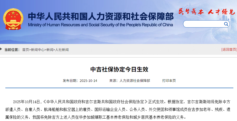香港中通社10月14日電 《中華人民共和國政府和吉爾吉斯共和國政府社會保險協定》14日正式生效。根據協定,吉爾吉斯斯坦將免除中方派遣人員、自雇人員、航海船舶和航空器上的僱員、國際運輸企業人員、公務人員、外交使團和領事館成員在吉參加老年、殘疾、遺屬保險的義務,中國將免除吉方上述人員在華參加城鎮職工基本養老保險和城鄉居民基本養老保險的義務。