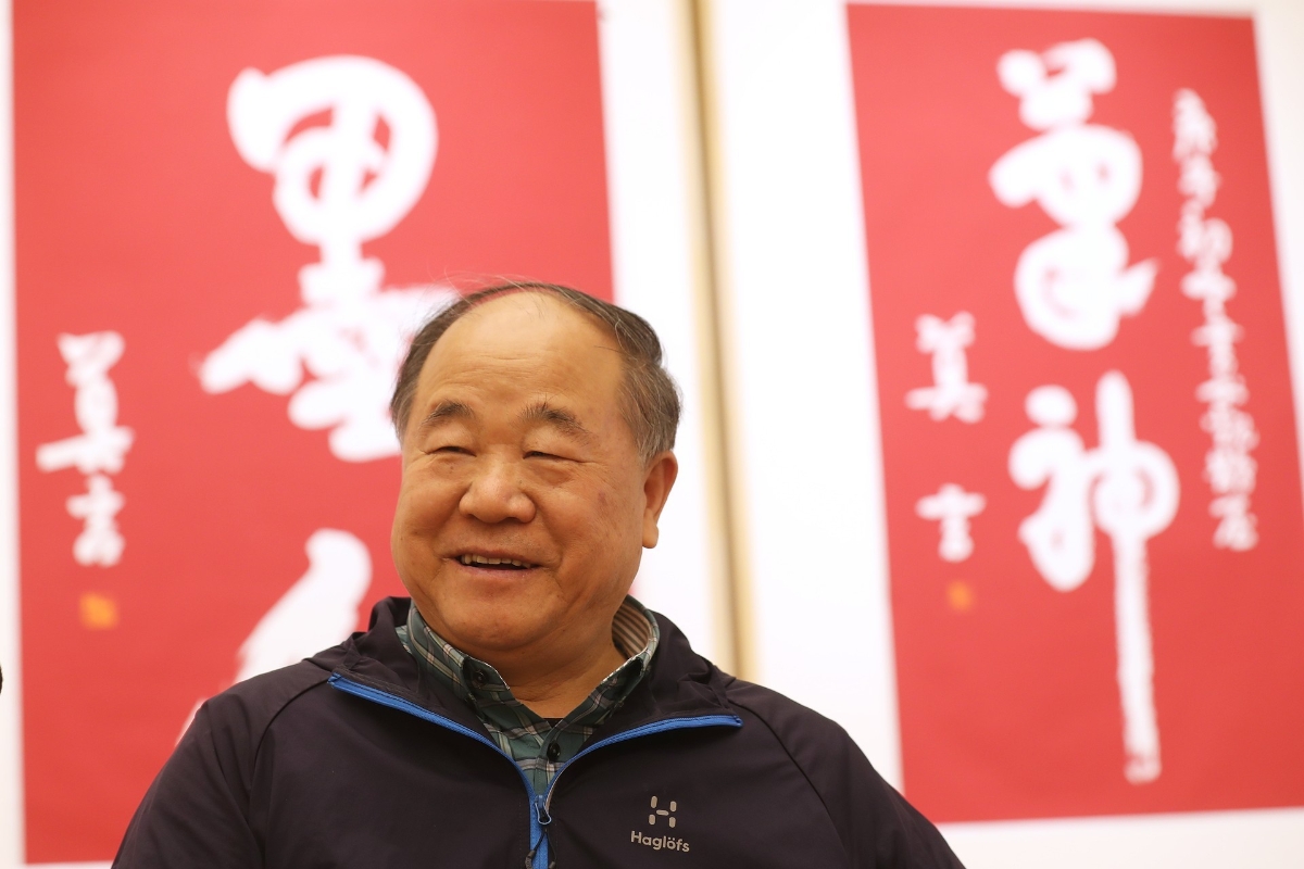 資料圖為莫言暢談自己書法創作的心得。香港中通社圖片