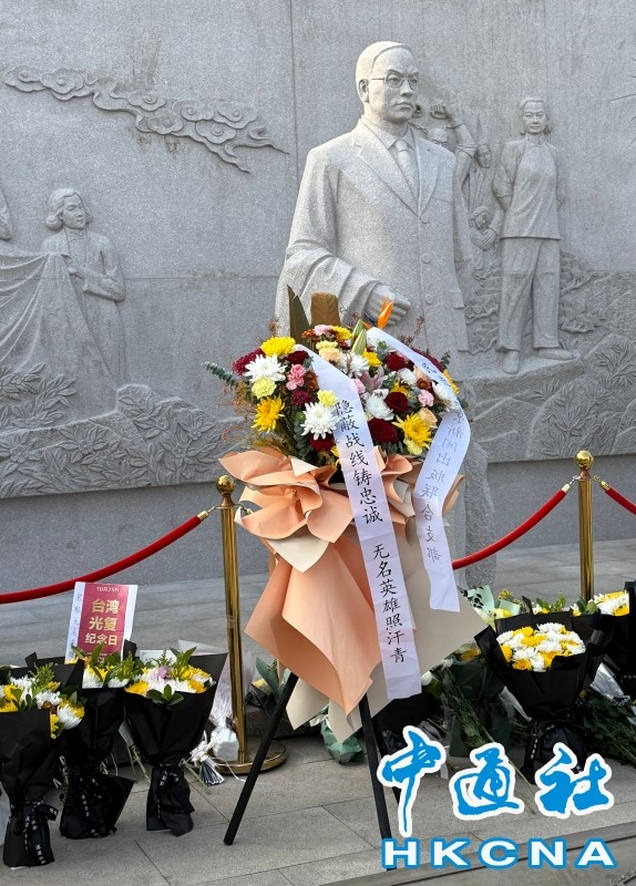 10月25日,北京西山無名英雄紀念廣場。吳石將軍塑像前,簇簇鮮花間,插有一張印著“10月25日台灣光復紀念日”的卡片。許多民眾選擇這一特殊的日子前來憑悼。 香港中通社圖片