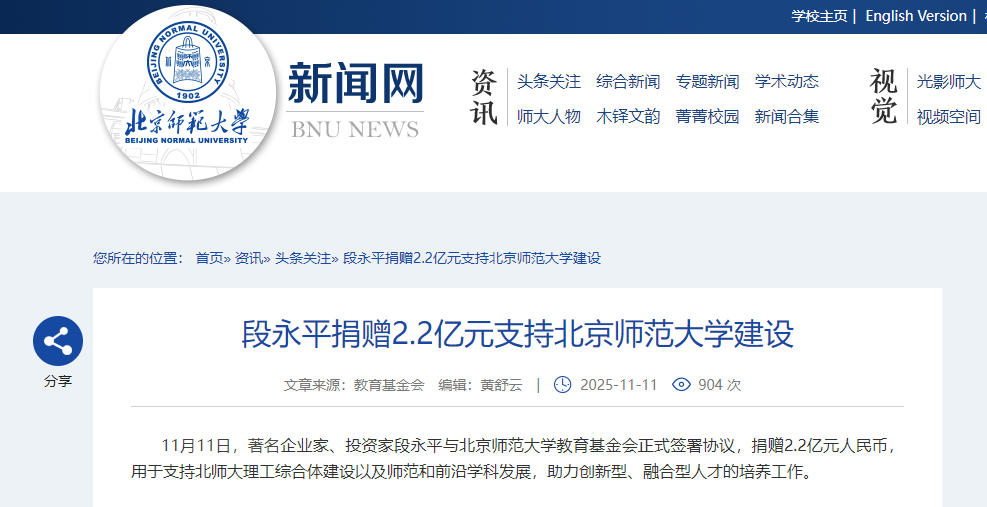 香港中通社11月11日電 據北京師範大學11日消息,中國知名企業家、投資家段永平與北京師範大學教育基金會正式簽署協議,捐贈2.2億元人民幣,用於支持北師大理工綜合體建設以及師範和前沿學科發展,助力創新型、融合型人才的培養工作。