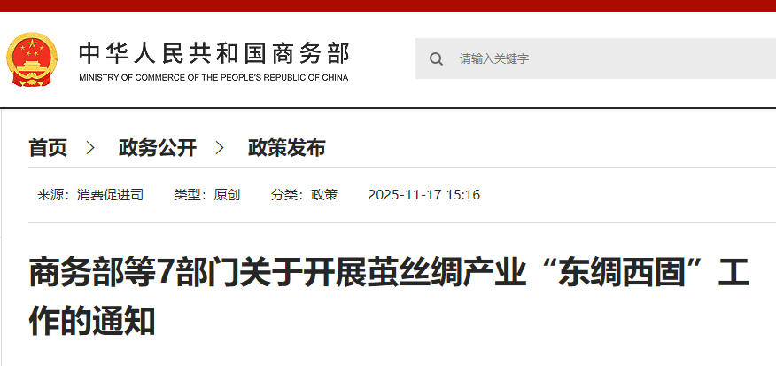 香港中通社11月17日電 中國商務部等7部門近日聯合印發了《關於開展繭絲綢產業“東綢西固”工作的通知》(以下簡稱《通知》)。要求統籌中國東中西部繭絲綢資源禀賦和產業基礎,形成繭絲綢產業“東部創新引領、中西部產能支撐、東中西部協同互補”的發展新格局。