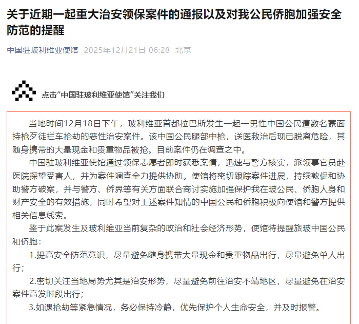 鑒於玻利維亞當前複雜的政治與社會經濟形勢,以及此案暴露出的治安風險,中使館特別向旅居當地的中國公民和僑胞發出三點安全提醒:一是提高防範意識,避免攜帶大量現金或貴重物品外出,盡量不單獨出行;二是密切關注當地治安動態,避免前往高風險區域或在案件高發時段外出;三是如遇搶劫等緊急情況,務必保持冷靜,優先確保人身安全,並立即報警。