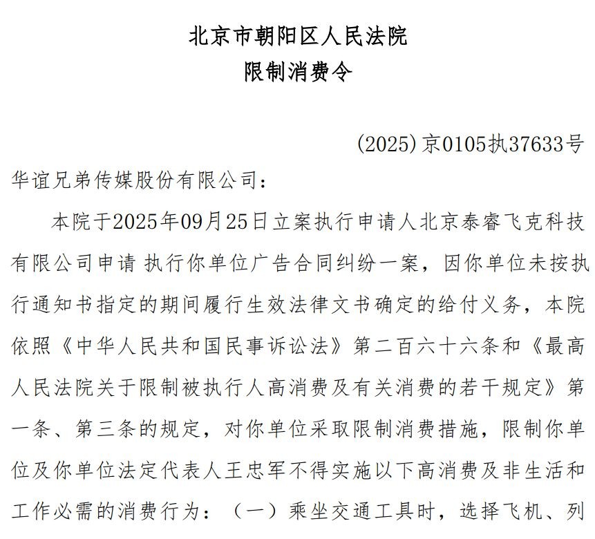 香港中通社12月29日電 天眼查顯示,近日,華誼兄弟電影有限公司、華誼兄弟傳媒股份有限公司及兩公司法定代表人王忠磊、王忠軍被限制高消費,涉及7473萬元人民幣執行案件,執行法院為北京市朝陽區人民法院。
