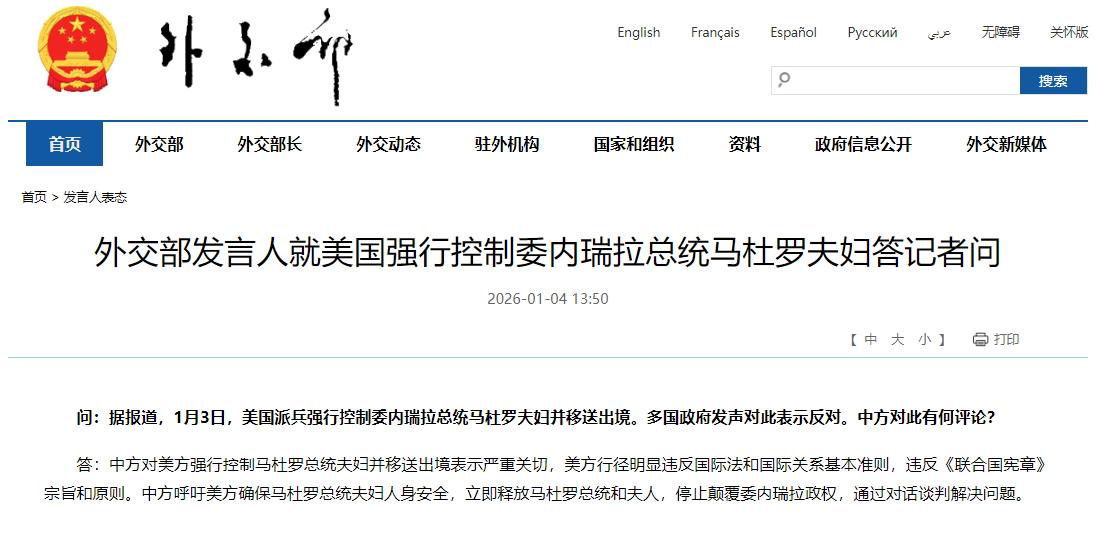 中國外交部發言人說,中方對美方強行控制馬杜羅總統夫婦並移送出境表示嚴重關切,美方行徑明顯違反國際法和國際關係基本準則,違反《聯合國憲章》宗旨和原則。中方呼籲美方確保馬杜羅總統夫婦人身安全,立即釋放馬杜羅總統和夫人,停止顛覆委內瑞拉政權,通過對話談判解決問題。(完)